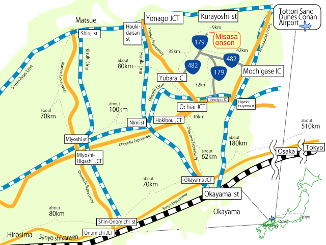 | By car; | from Osaka Suita I.C. (Chugoku Expressway) get off Innosyou I.C. R179 to Misasa Onsen |