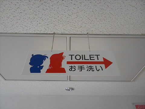 Watch your head! The restroom signs featuring portraits of Conan and Ran Mouri(Rachel Moore) were super cute.